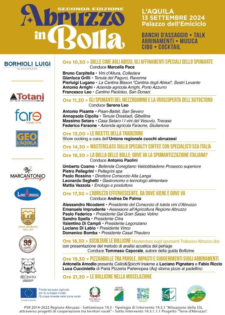 Gli affinamenti speciali dello spumante, da quelli sotto l’acqua del mare a quelli sotto la neve in alta quota, gli spumanti del Mezzogiorno e la riscoperta degli autoctoni, lo stato dell’arte della spumantizzazione italiana e quello della spumantizzazione abruzzese, attraverso ospiti di caratura nazionale, produttori, enologi, distributori e critici di fama. Sarà ricco il programma della seconda edizione di Abruzzo in Bolla, il primo e unico evento dedicato agli spumanti in programma venerdì 13 settembre all’Aquila, al colonnato di Palazzo dell’Emiciclo. Dopo il successo della prima edizione, la manifestazione torna con un programma ancora più ricco e il doppio delle cantine rispetto allo scorso anno.